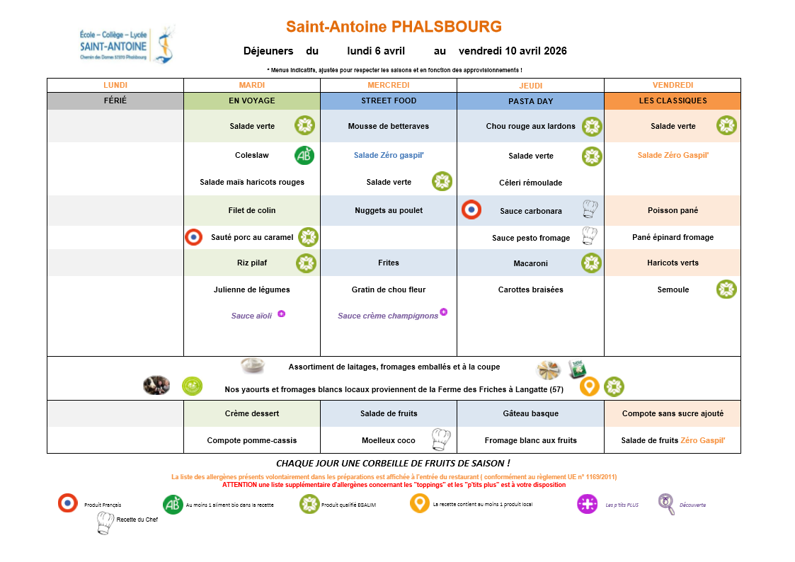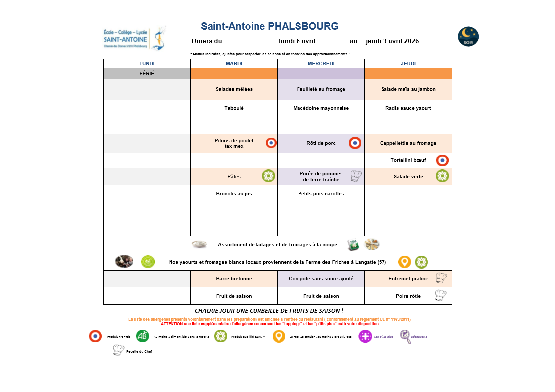 Menu de la semaine / du 06 au 10 Avril 2026 Menus 9 avr. Écrit par Romain Sassenhoff Déjeuner Dîner Voir les allergènes du déjeuner Voir les allergènes du dîner Romain Sassenhoff