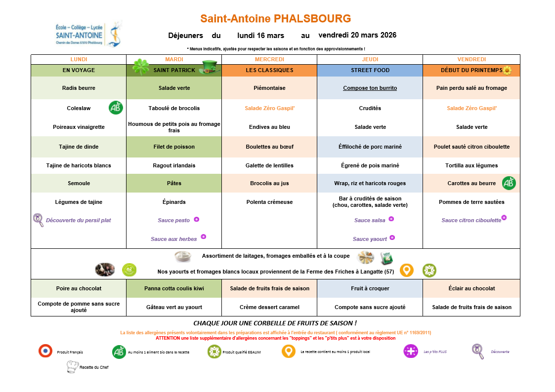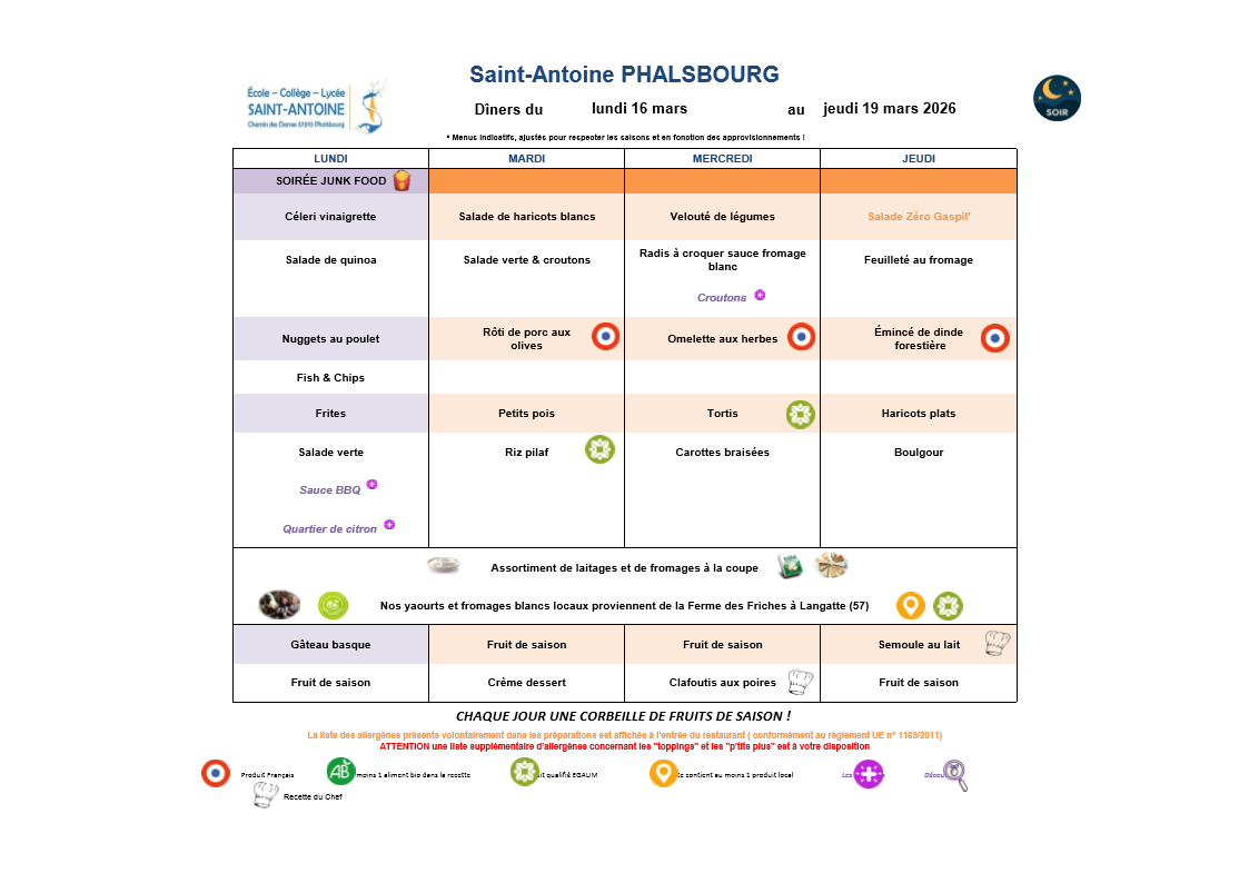 Menu de la semaine / du 16 au 20 Mars 2026 Menus 18 mars Écrit par Romain Sassenhoff Déjeuner Dîner Voir les allergènes du déjeuner Voir les allergènes du dîner Romain Sassenhoff