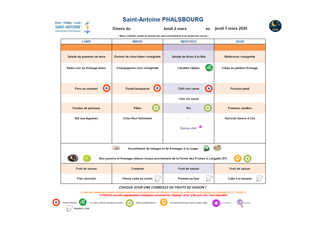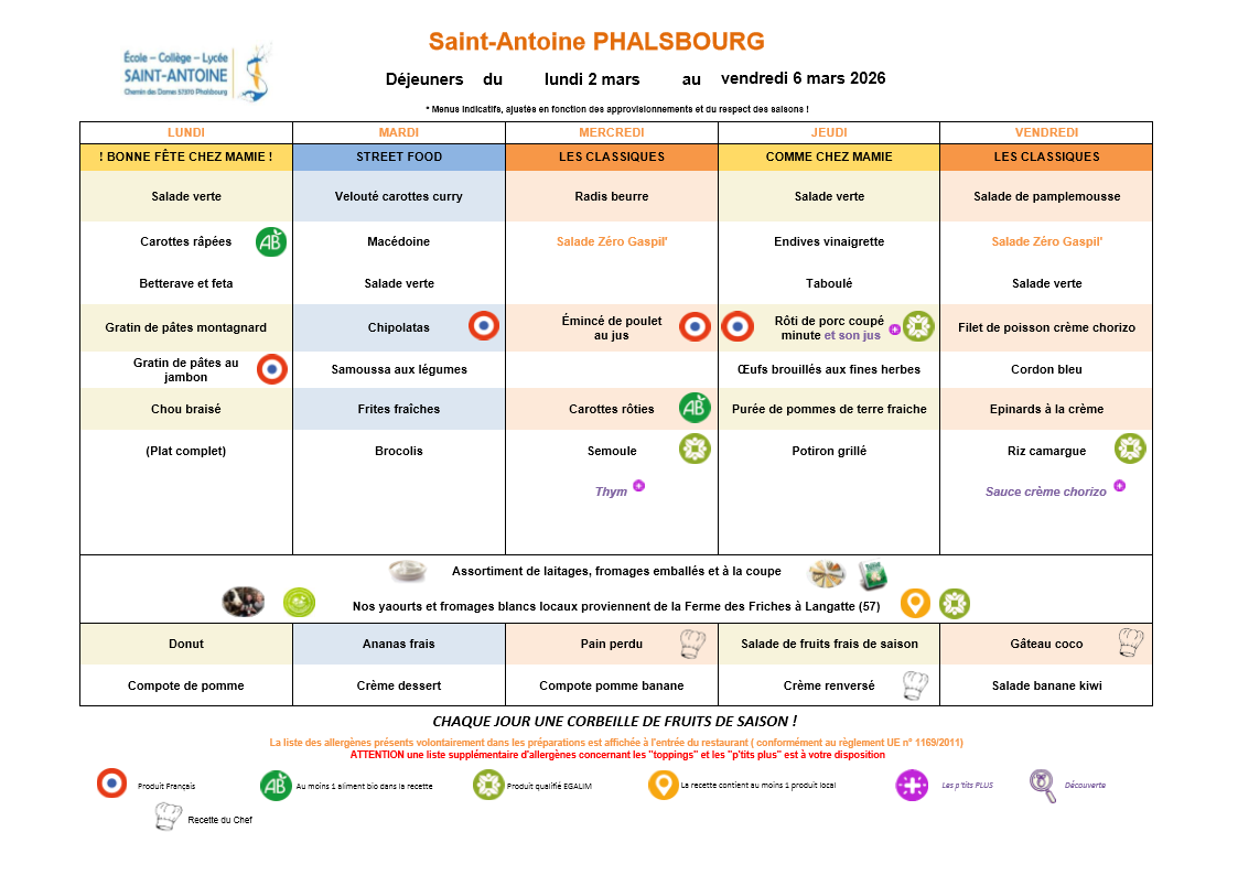 Menu de la semaine / du 02 au 06 Mars 2026 Menus 5 mars Écrit par Romain Sassenhoff Déjeuner Dîner Voir les allergènes du déjeuner Voir les allergènes du dîner Romain Sassenhoff