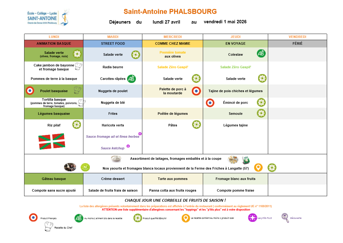 Menu de la semaine / du 27 Avril au 01 Mai 2026 Menus 20 avr. Écrit par Romain Sassenhoff Déjeuner Dîner Voir les allergènes du déjeuner Voir les allergènes du déjeuner Voir les allergènes du dîner Voir les allergènes du dîner Romain Sassenhoff