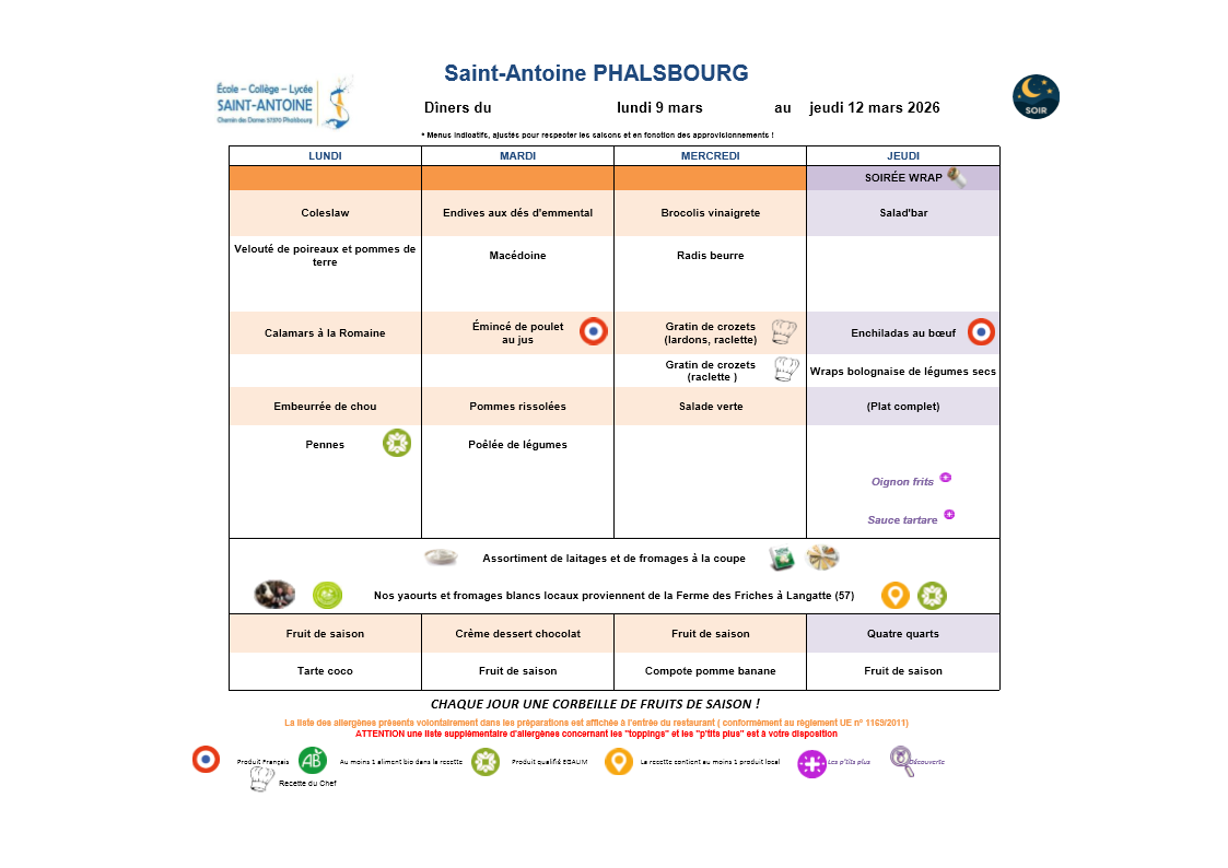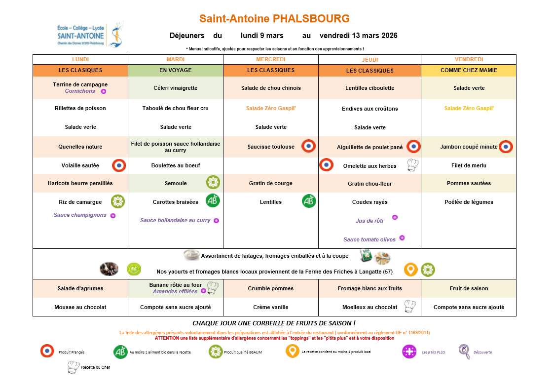 Menu de la semaine / du 09 au 13 Mars 2026 Menus 9 mars Écrit par Romain Sassenhoff Déjeuner Dîner Voir les allergènes du déjeuner Voir les allergènes du dîner Romain Sassenhoff